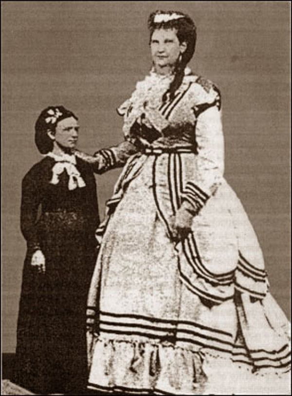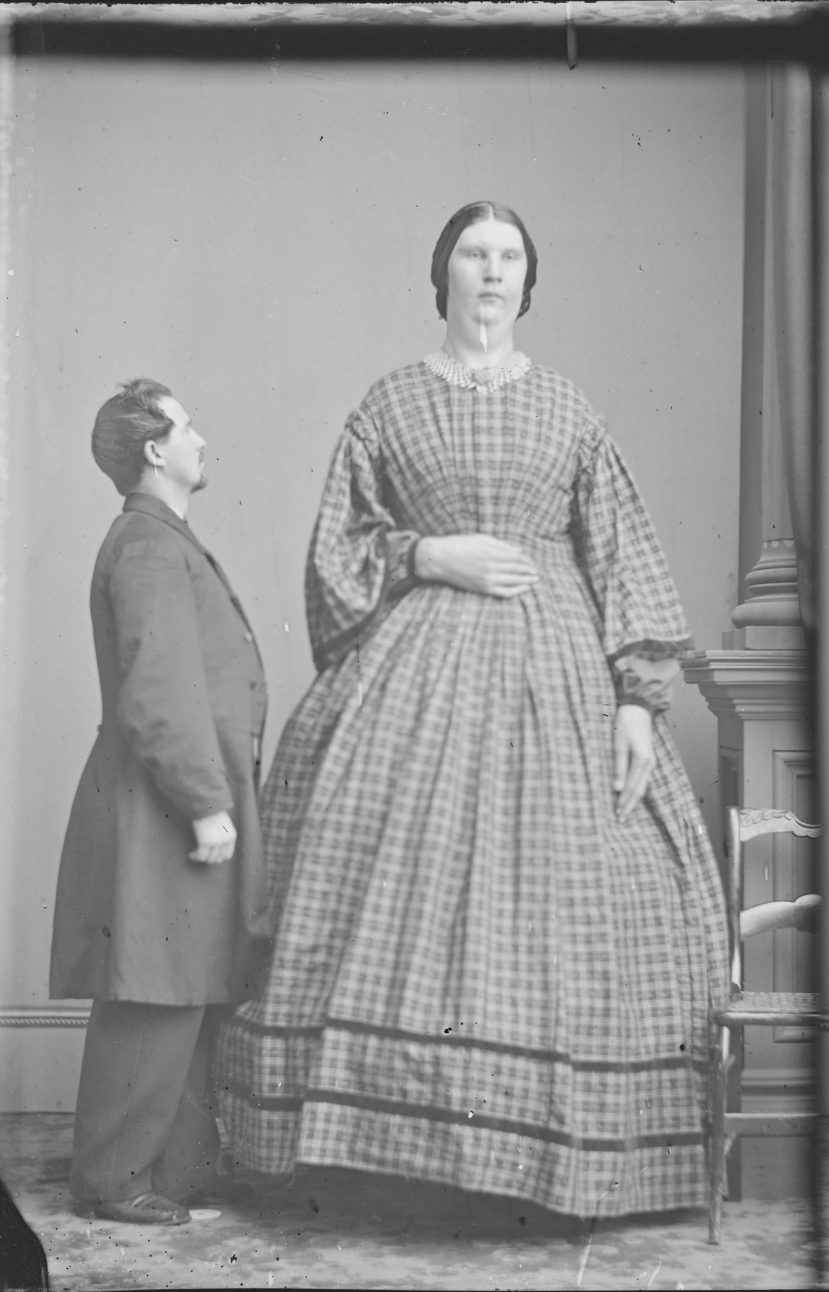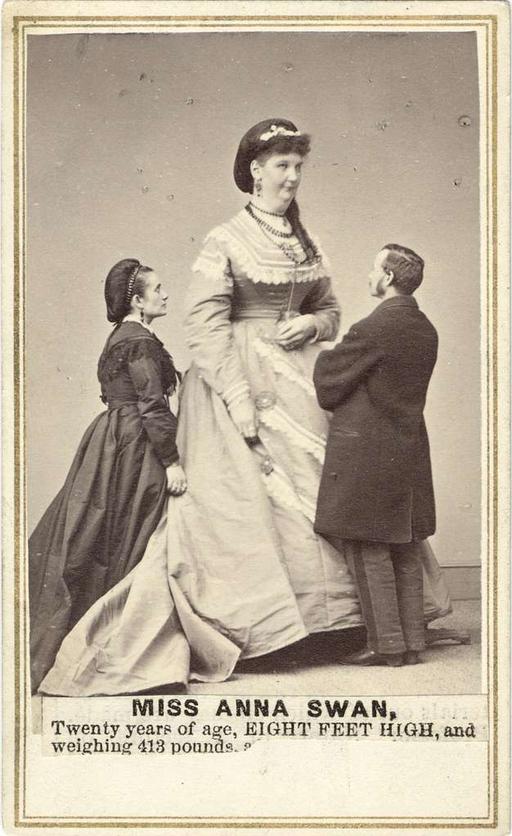 The third of thirteen kids in New Annan, Nova Scotia, Canada, Anna's phenomenal growth started when she was born. She was 6 feet at 10 years old and 7 feet at 15. A smart girl, she loved acting (playing Lady Macbeth!), singing and piano playing. In 1863, she worked for P. T. Barnum's circus, touring the US and Europe. She nearly died during a fire at his American Museum, but was saved through a window. In Halifax, she met fellow giant Martin Van Buren Bates, who she married on June 17th, 1871. Queen Victoria gave her a satin gown and diamond ring! Anna gave birth to a girl in 1872 and a boy in '79, but they died shortly after. He was 28 inches tall, the longest baby ever. Anna and Martin toured with the W. W. Cole Circus from 1878-80 before retiring to their farm in Seville, Ohio. She taught Sunday school at the local Baptist church. A week after passing away from heart failure, Anna was buried in Mound Hill Cemetery beside her sister and children. Since 2009, her great grand nephew, Dale, has run the Anna Swan Museum at the Creamery Heritage Centre in Tatamagouche, Nova Scotia.